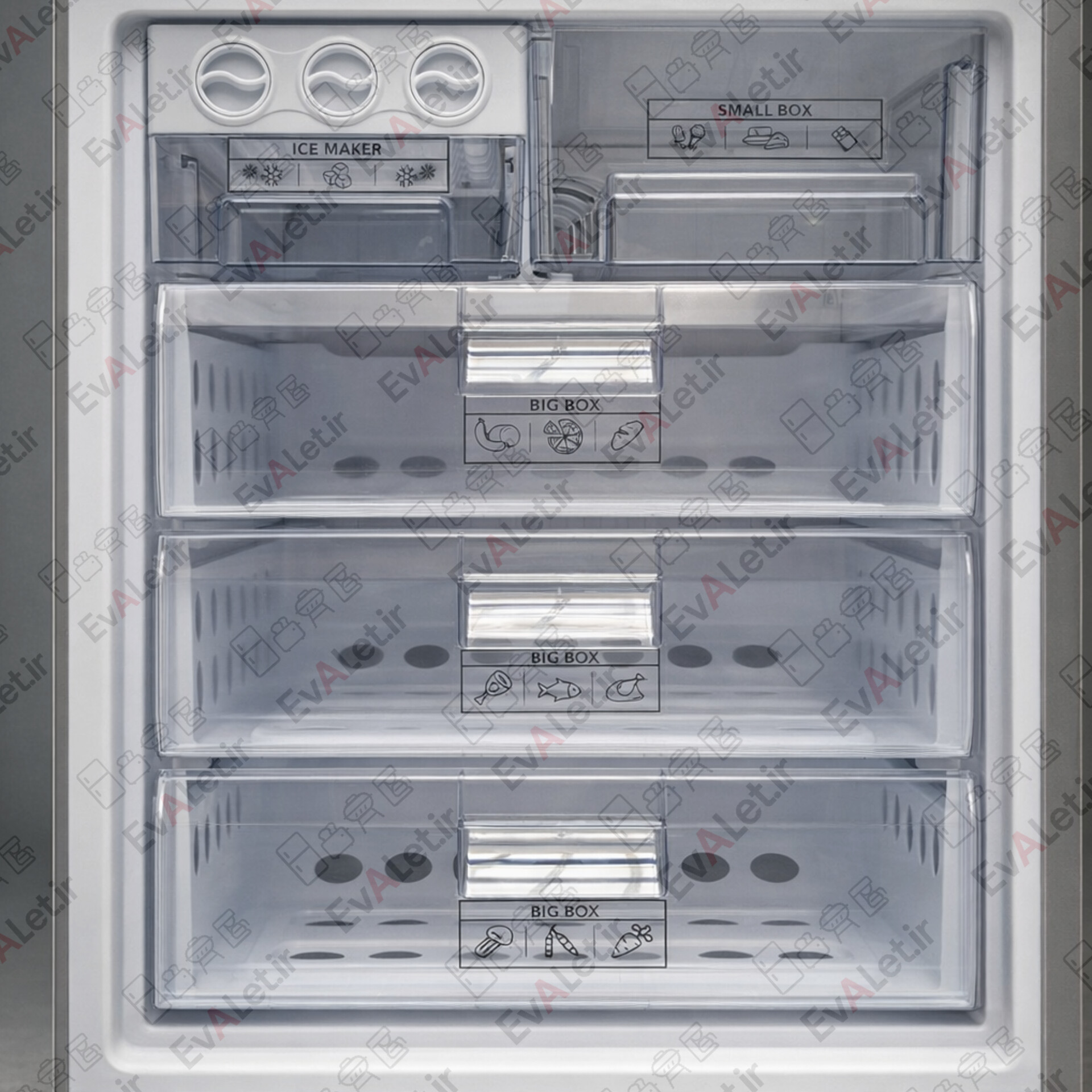 بخش فریزر: ۱ طبقه و ۳ کشوی بزرگ، یخساز دستی و ۱ طبقه روی درب